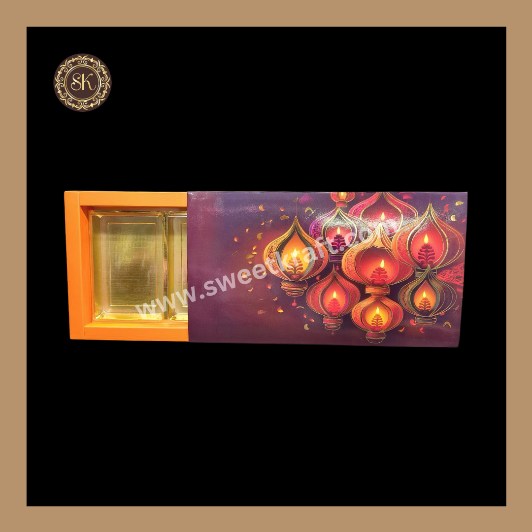 This 18-cavity Diwali box is perfect for gifting chocolates or mithai to your Family. The Orange Colour box with a golden Foil matte finish print adds a touch of elegance to the Diwali celebration. Make your gifts stand out with this beautiful and festive Chocolate box.